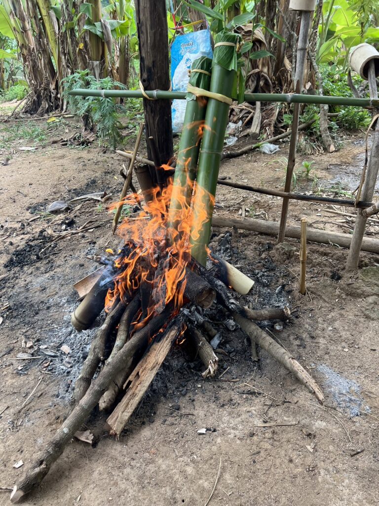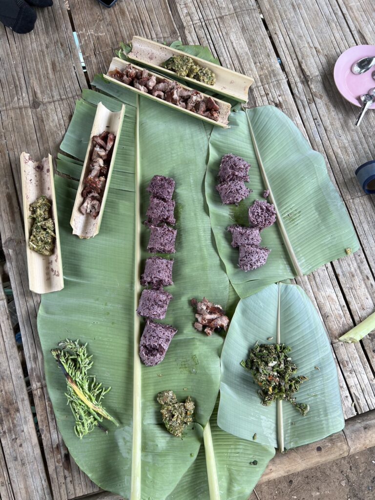 Lunch (Akha-style cooking): We will prepare sticky rice cooked in bamboo, pork BBQ, and eggplant salad. You are welcome to join in the cooking for a hands-on experience.