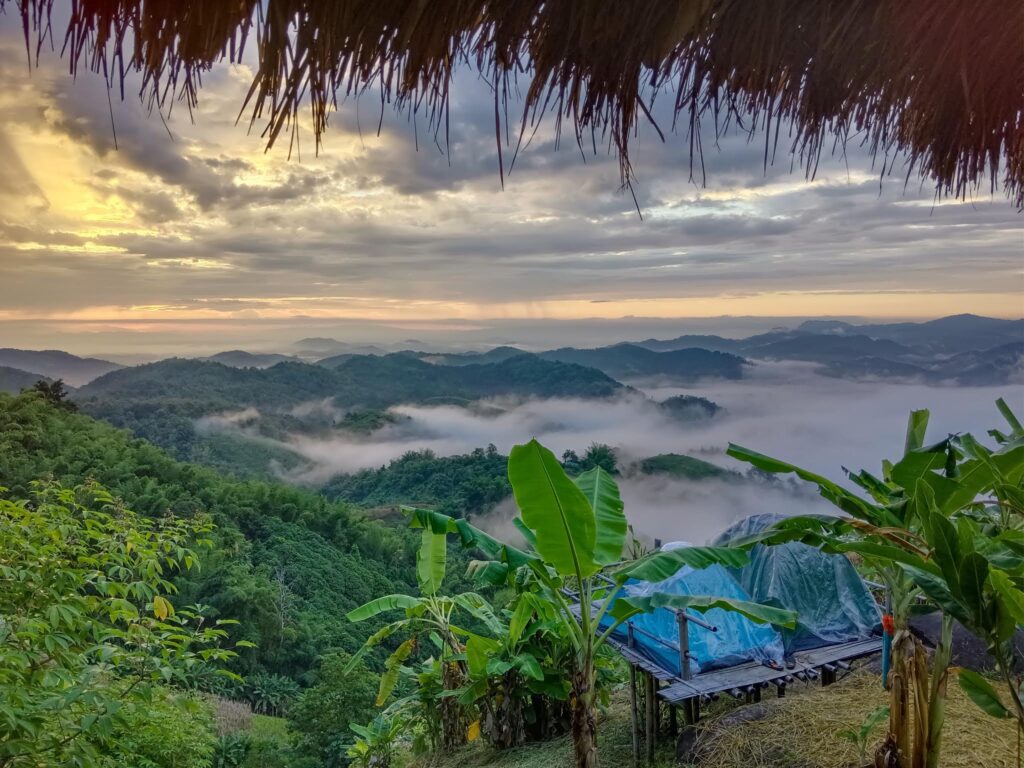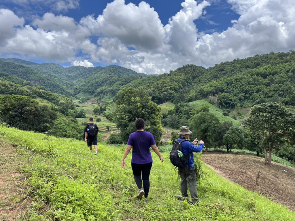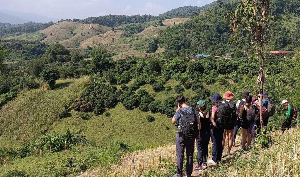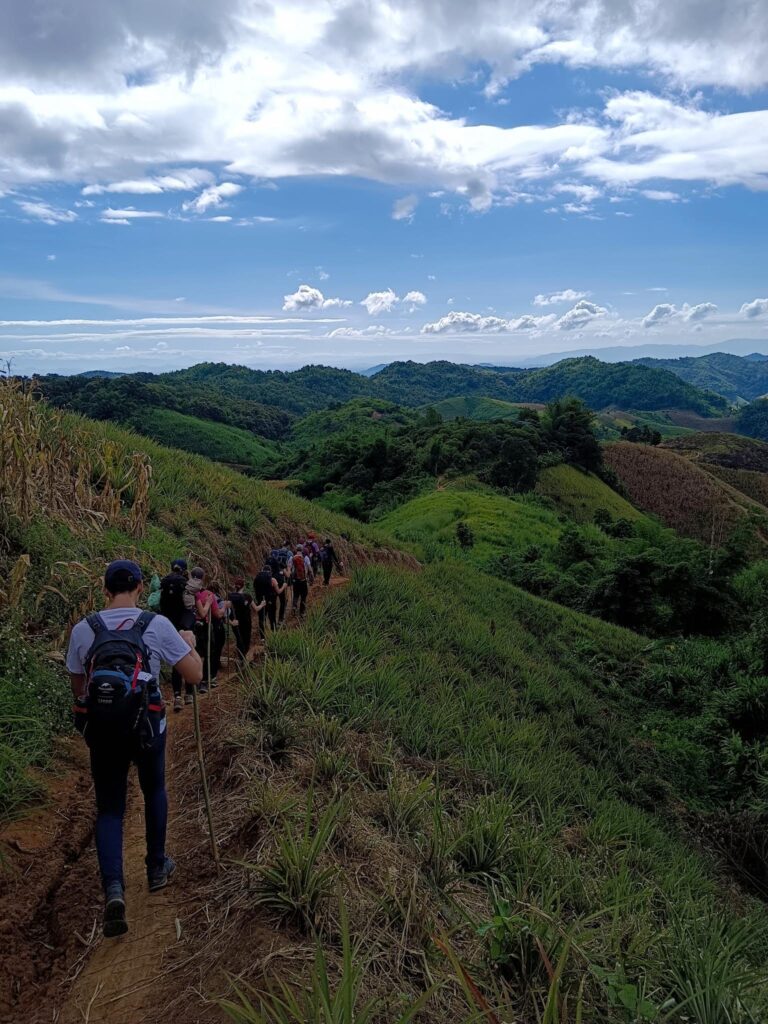 Walking: Upon arriving at the village, we begin trekking along a small river and explore Akha agriculture, including tea, banana, and coffee plantations. We then continue hiking up and down through bamboo forests, enjoying views of highland farming, mountain rice fields, and pineapple plantations.